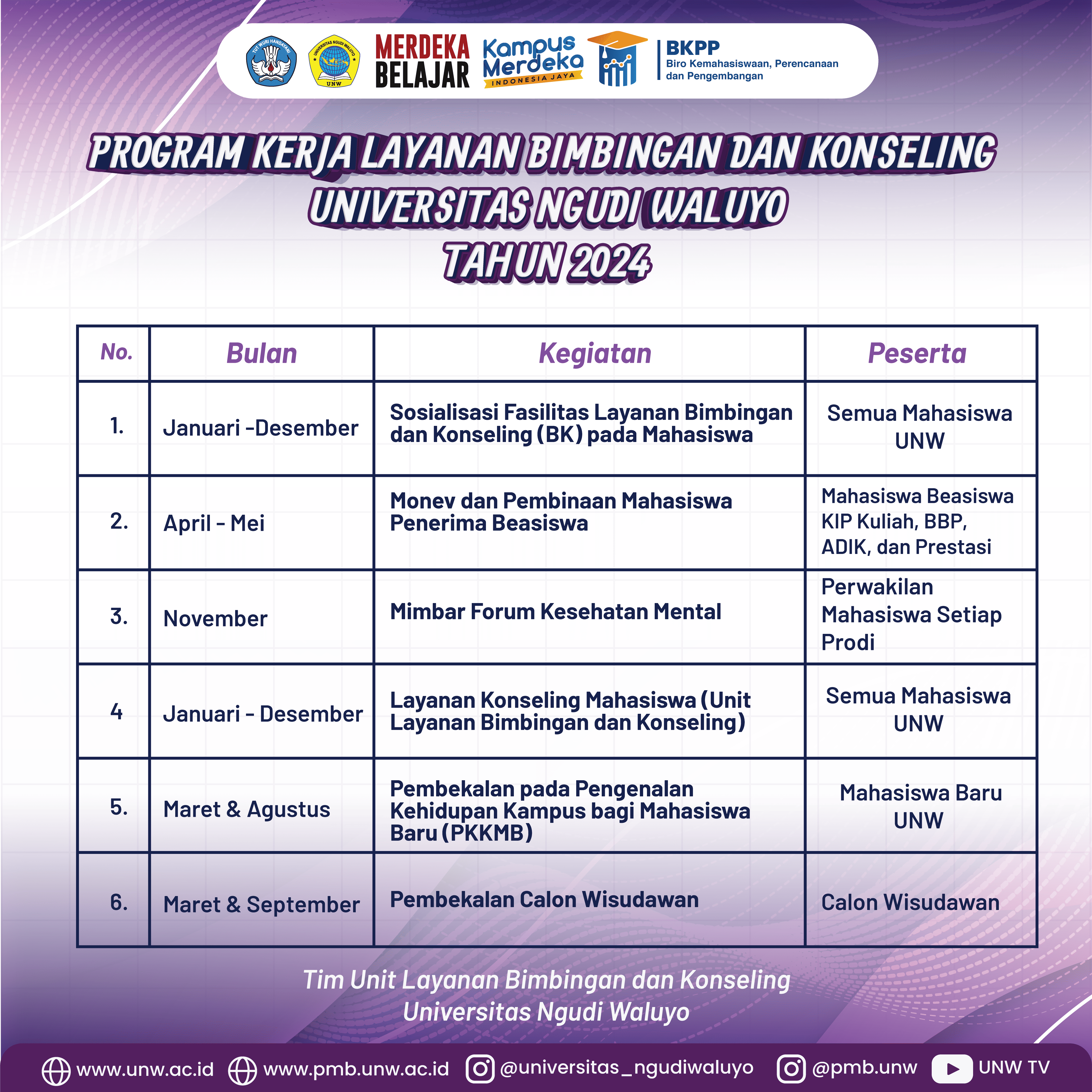 hadir untuk memberikan dukungan kesejahteraan mahasiswa. Layanan BK ini dapat menjadi tempat aman bagi mahasiswa untuk berbicara dan mendapatkan dukungan. Selain itu, menjadi sarana yang bermanfaat dalam memperkuat kesejahteraan mental dan emosional mahasiswa di lingkungan kampus UNW.